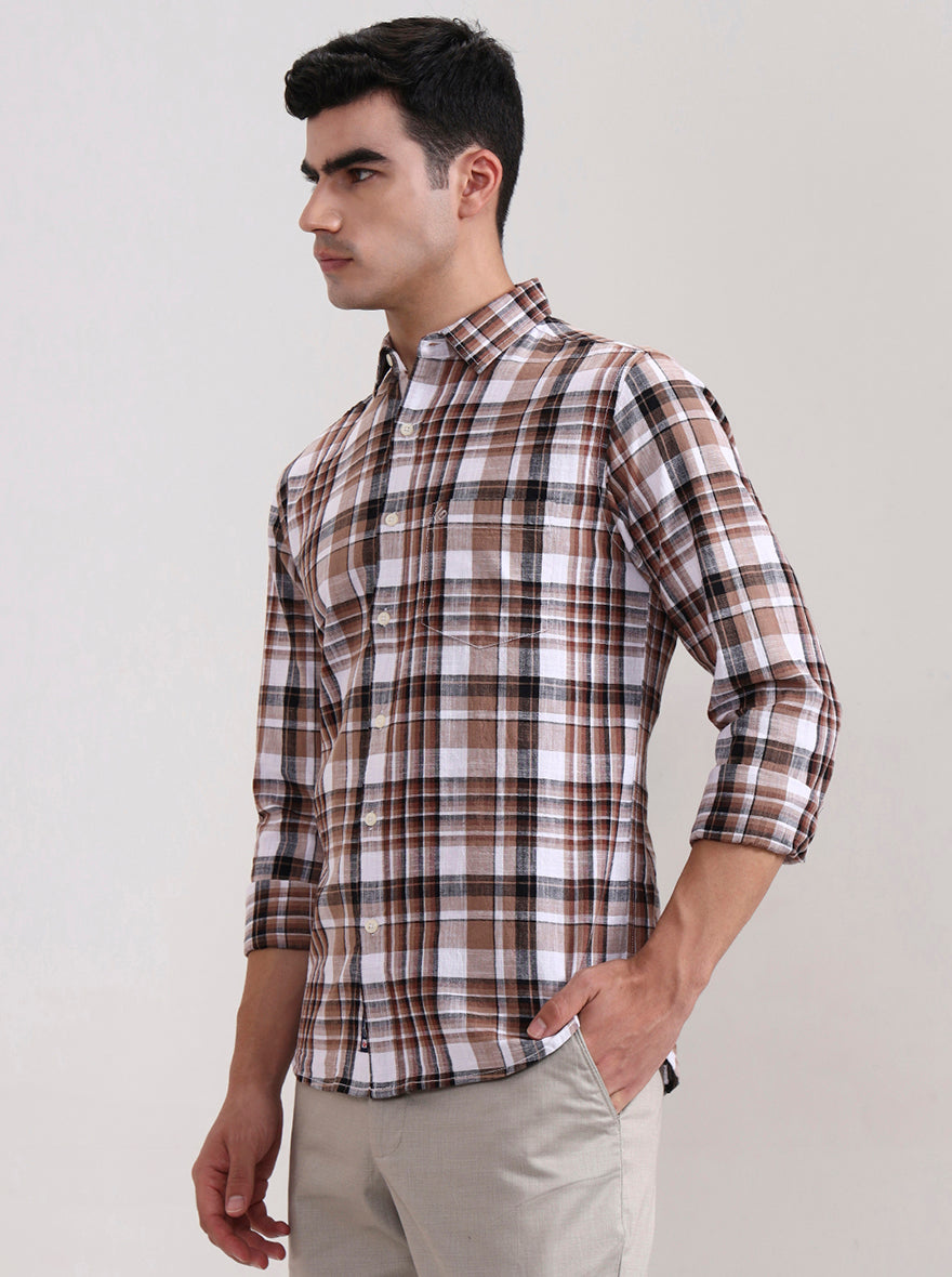Beige Checked Slim Fit Casual Shirt | Greenfibre