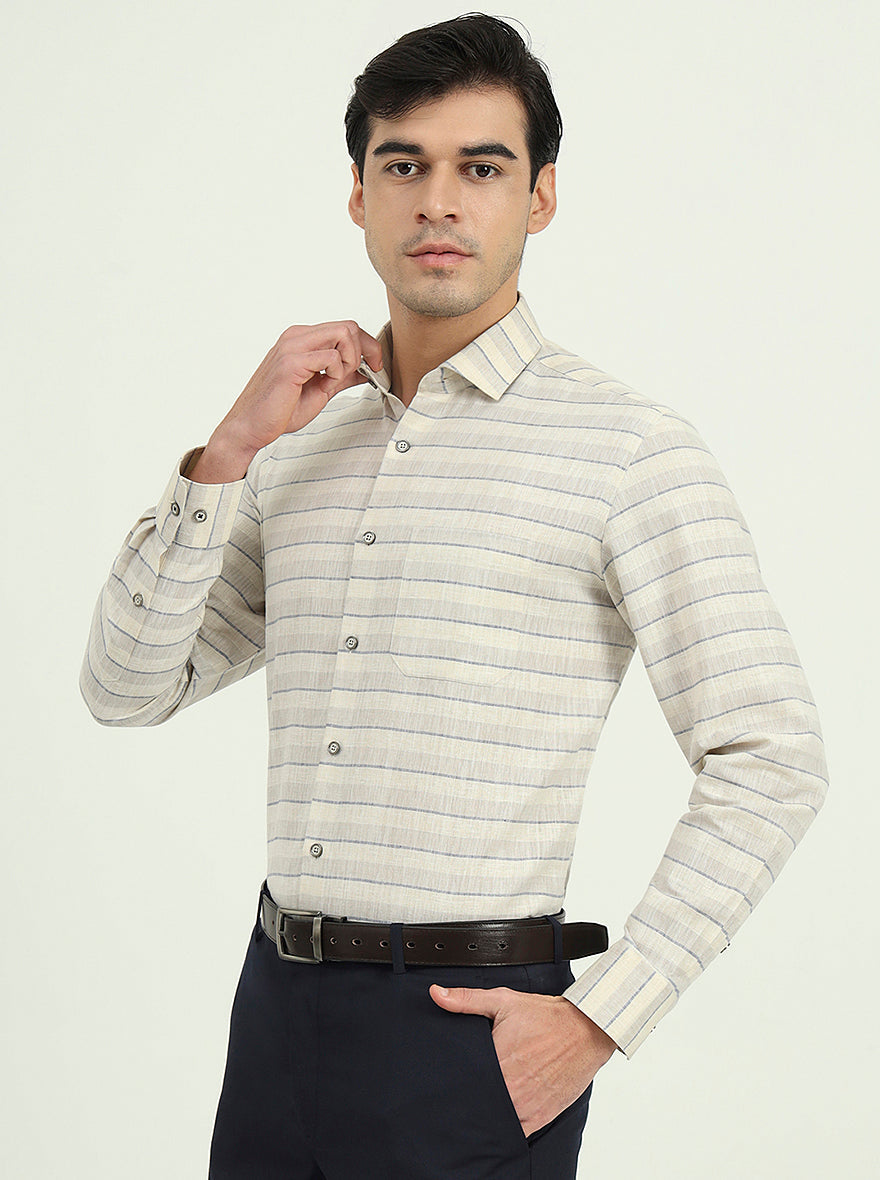 Details: Make a sophisticated statement at your next celebration with this Greenfibre beige striped shirt. The slim fit and comfortable cotton blend ensure you look and feel great. The classic stripe pattern adds a touch of timeless style. With full sleeves and a regular collar, this shirt is perfect for adding a unique and fashionable touch to your party wear.