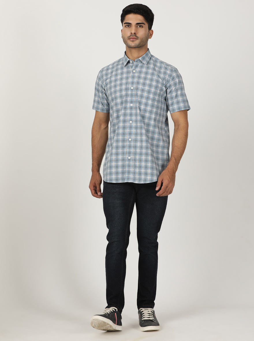 Light Blue Checked Smart Fit Semi Casual Shirt | Greenfibre