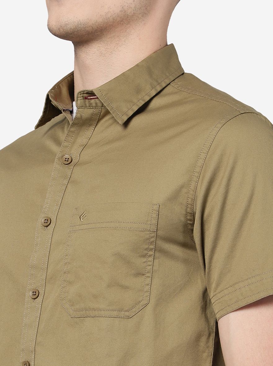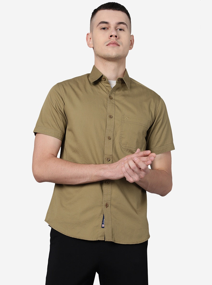 Details: Upgrade your style with this Light Olive 100% Cotton Semi Casual Shirt from Greenfibre. Fabricated with 100% Cotton promises a comfortable and breathable wearing experience. Offers a slim fit for a sleek look that has been elevated with a Solid pattern. Features with a chest pocket, half sleeves, and a regular shirt collar. Match it with the well-fitted trousers of your choice and a pair of oxford shoes and you are ready to go.