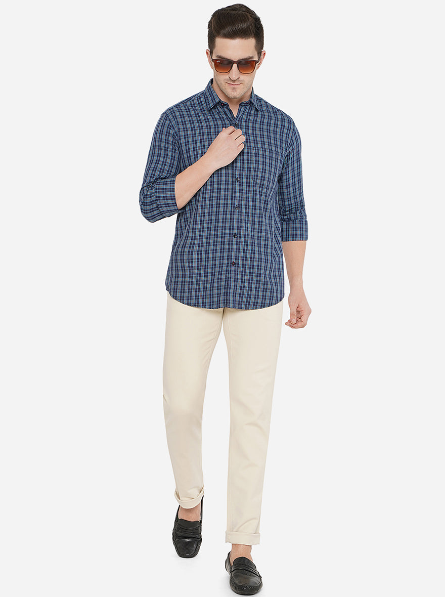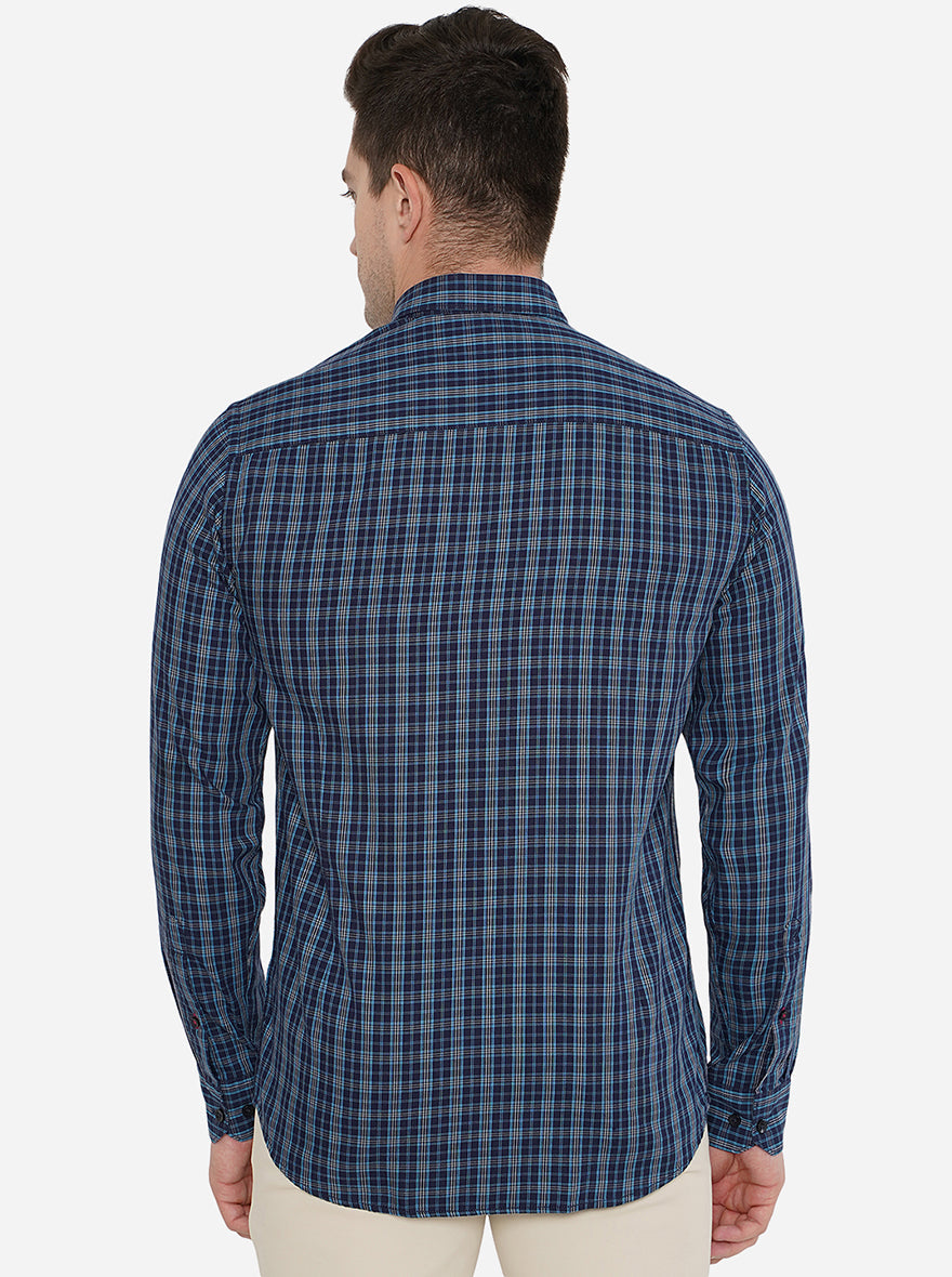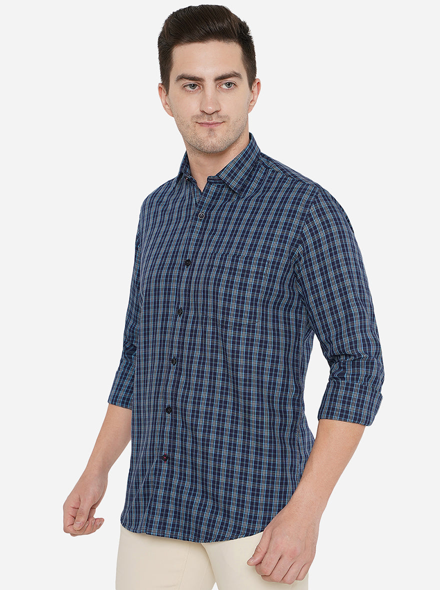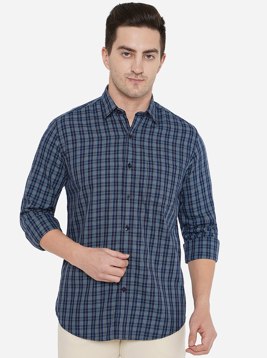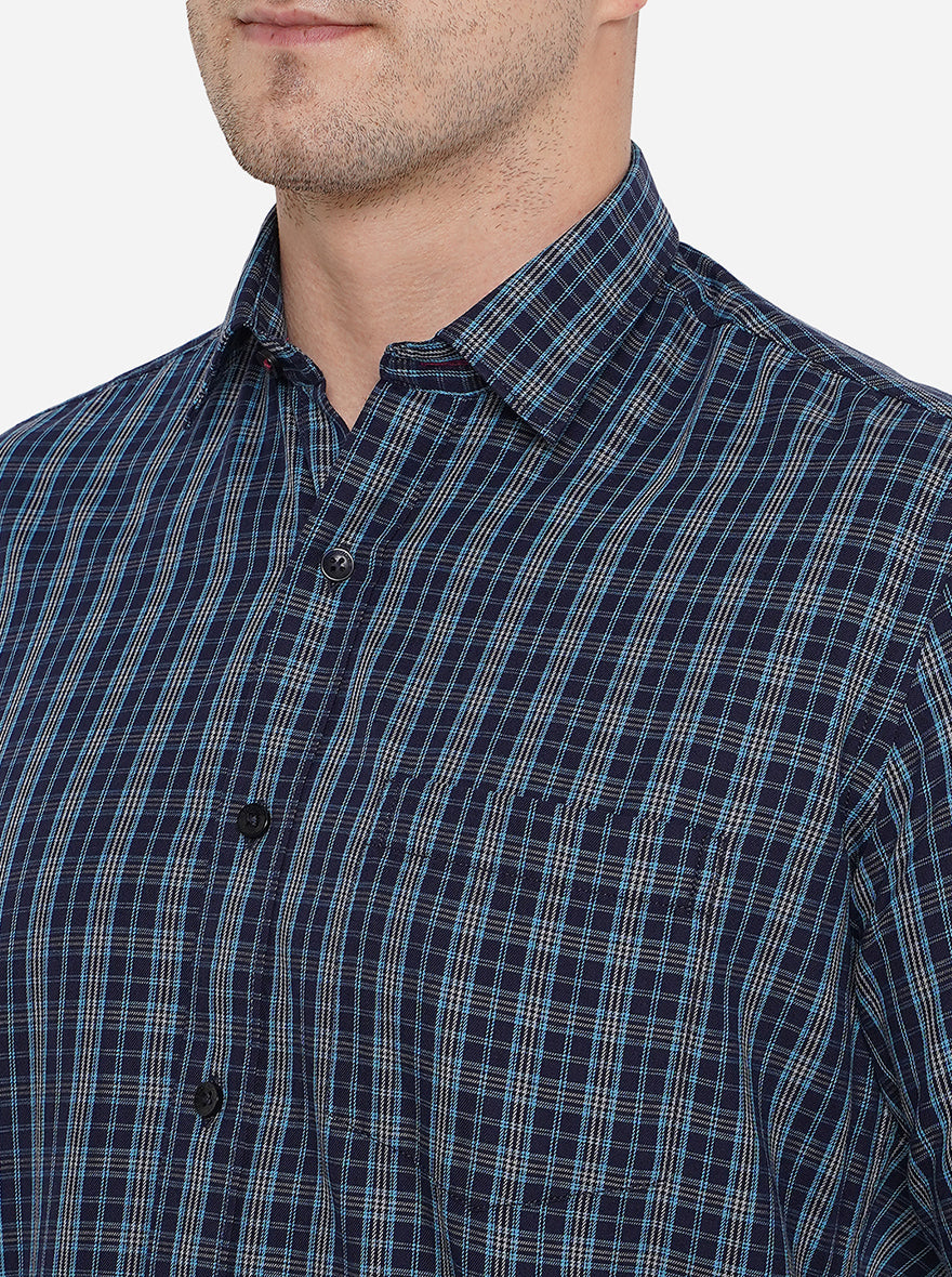 Navy Blue Checked Slim Fit Casual Shirt | Greenfibre