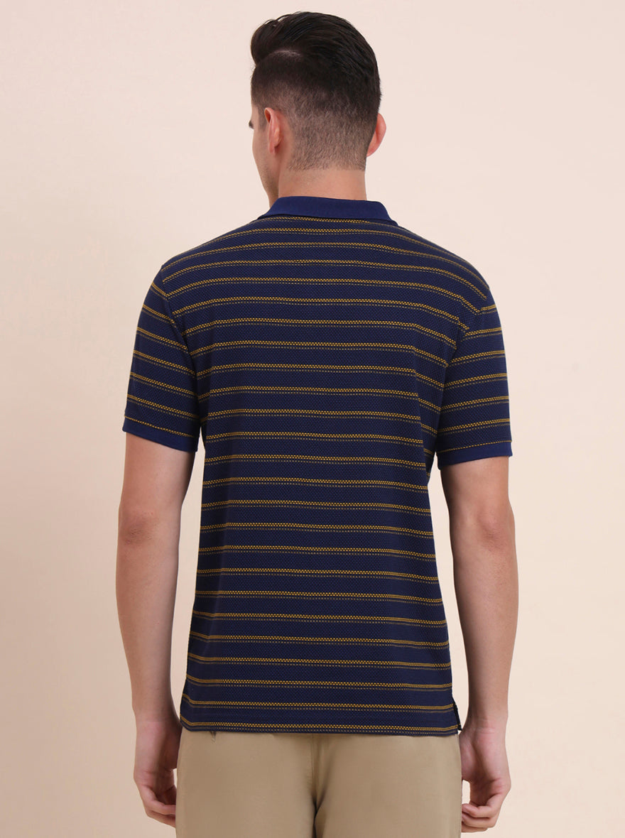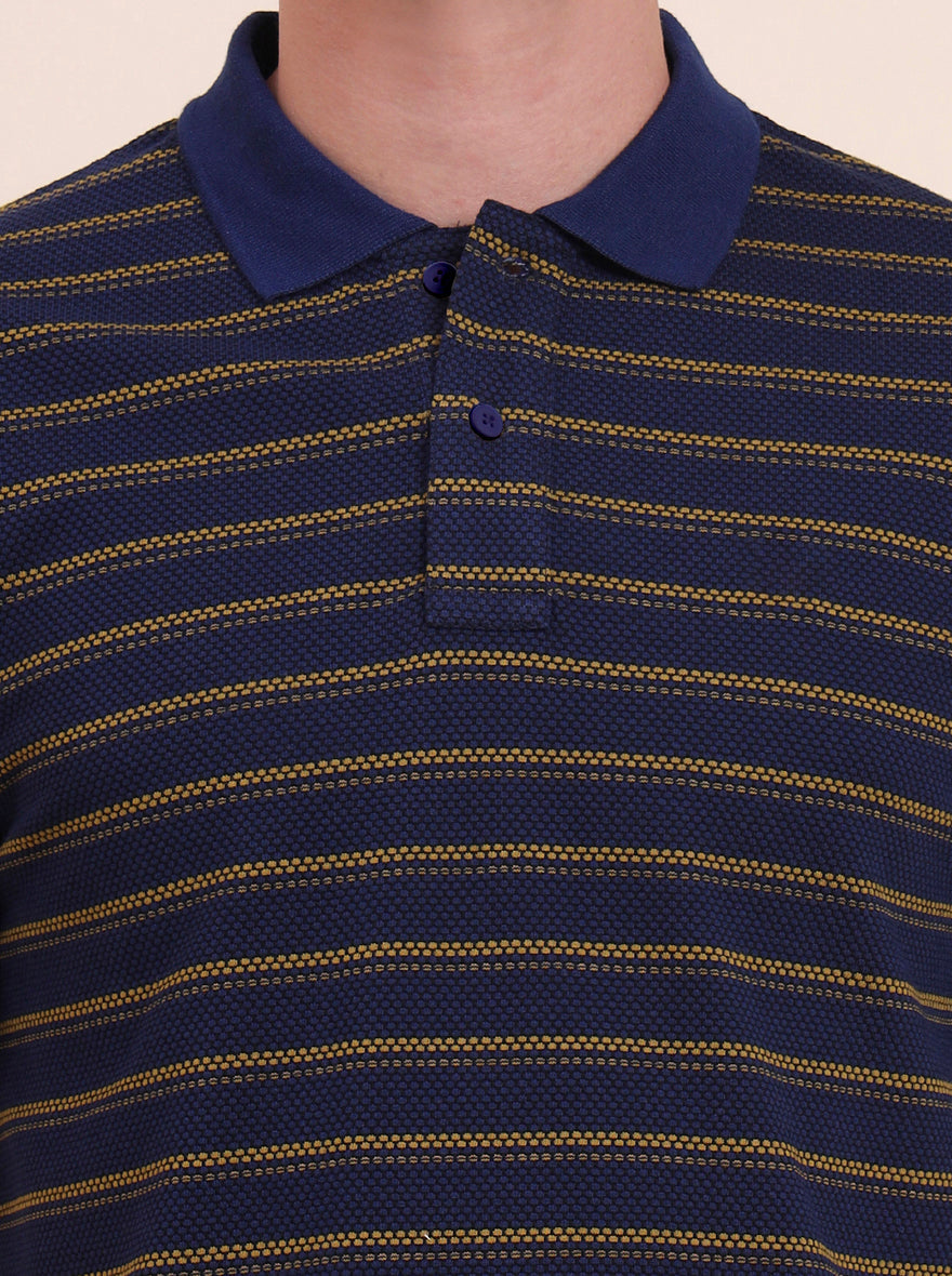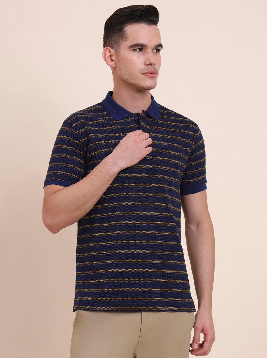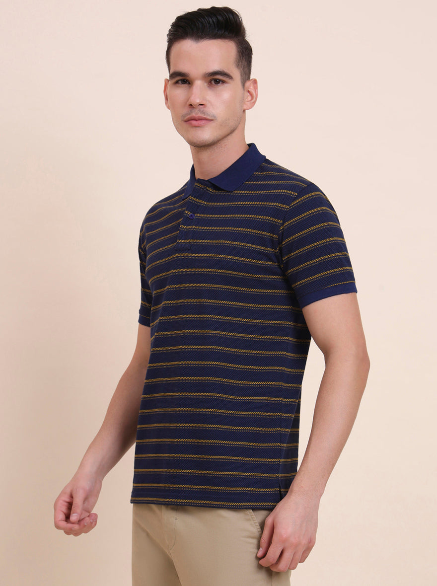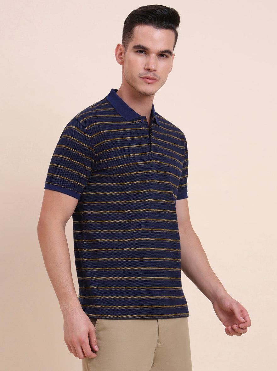 Navy Blue & Mustard Striped Slim Fit Polo T-Shirt | Greenfibre