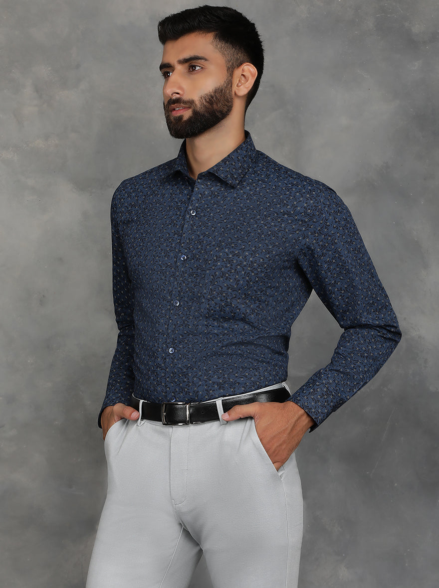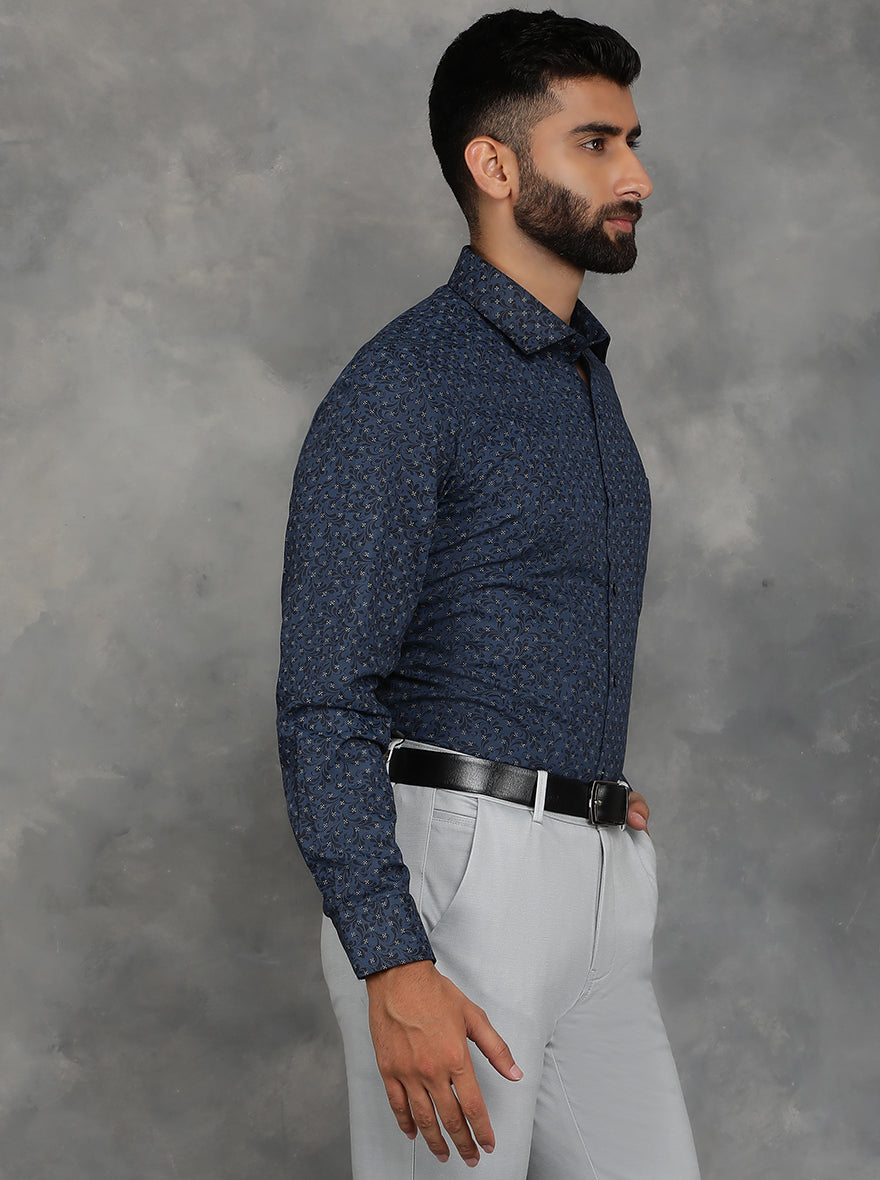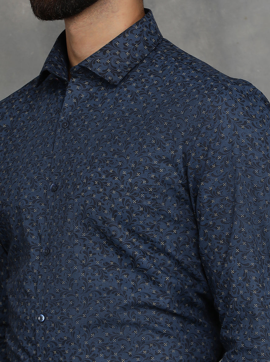 Navy Blue Printed Slim Fit Formal Shirt | GreenFibre