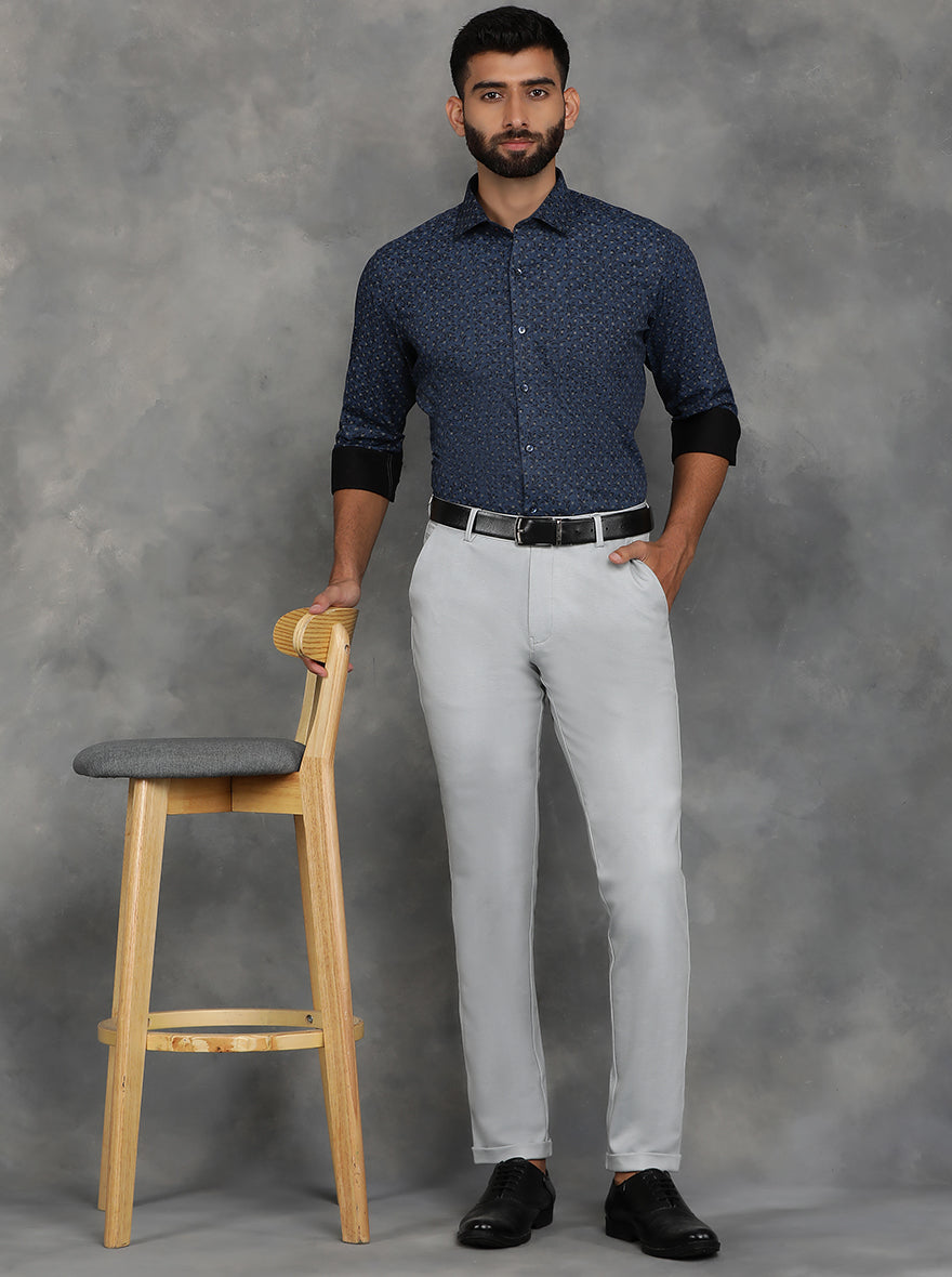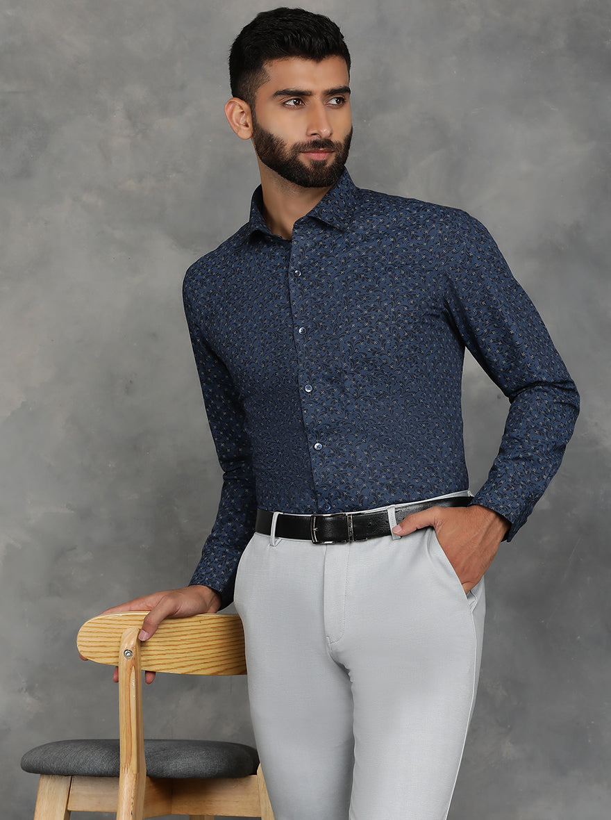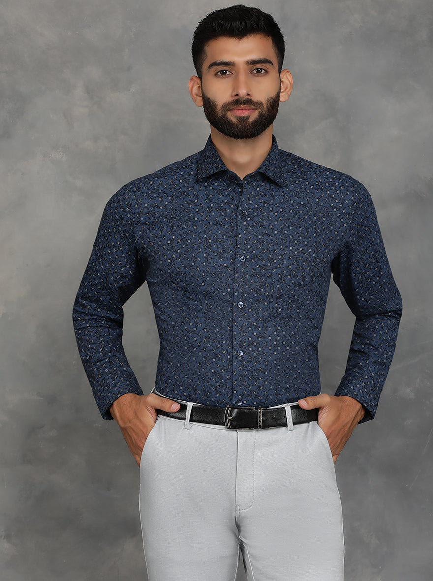 Navy Blue Printed Slim Fit Formal Shirt | GreenFibre