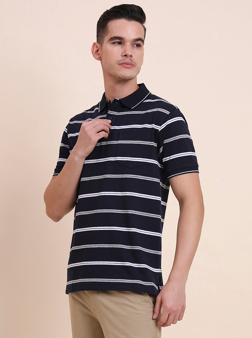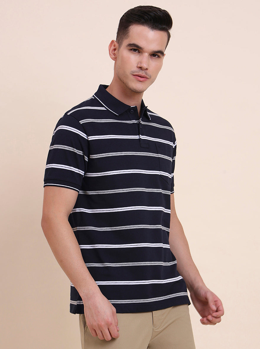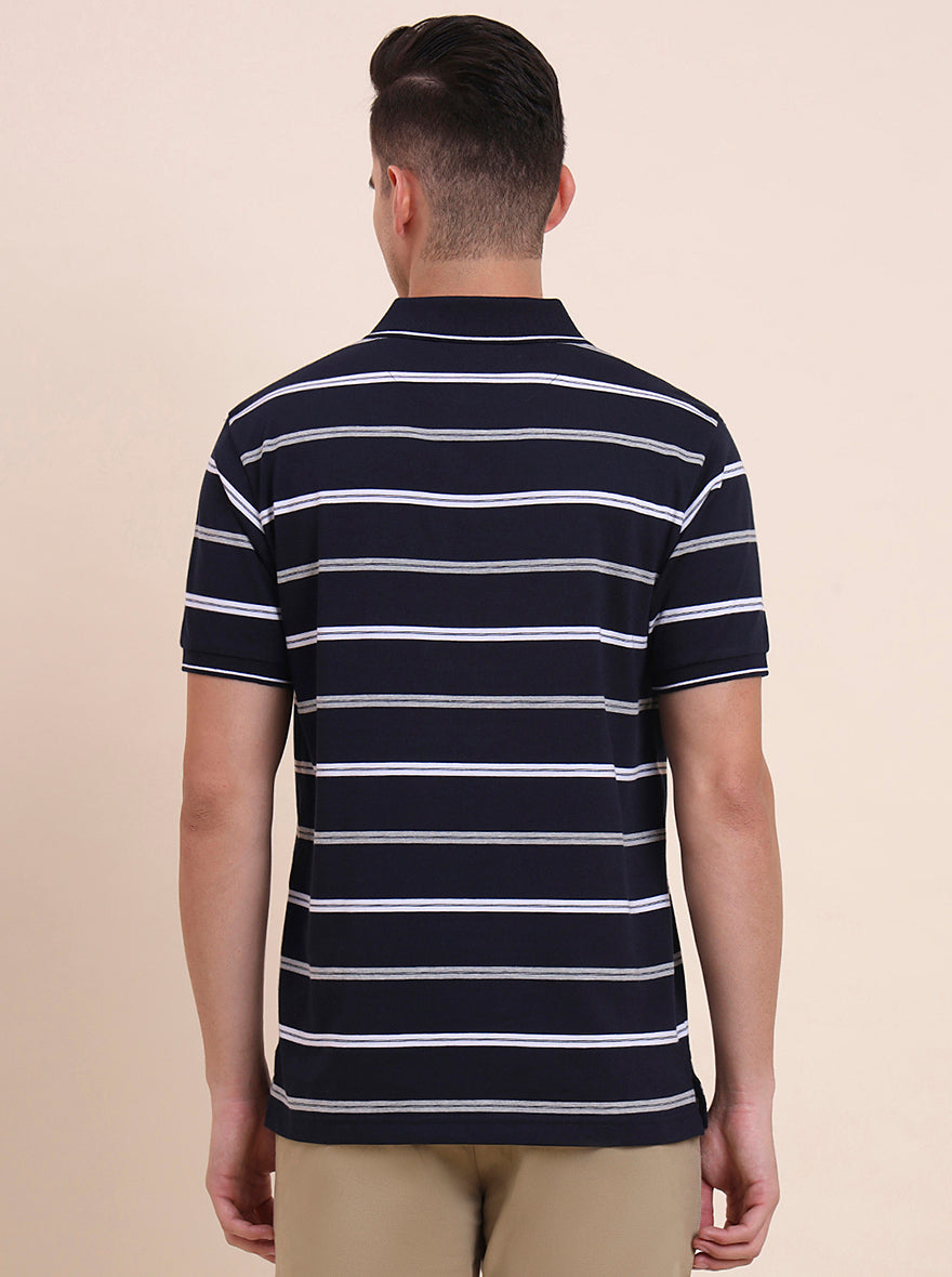 Navy Blue & White Striped Regular Fit Polo T-Shirt | Greenfibre