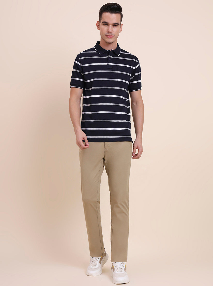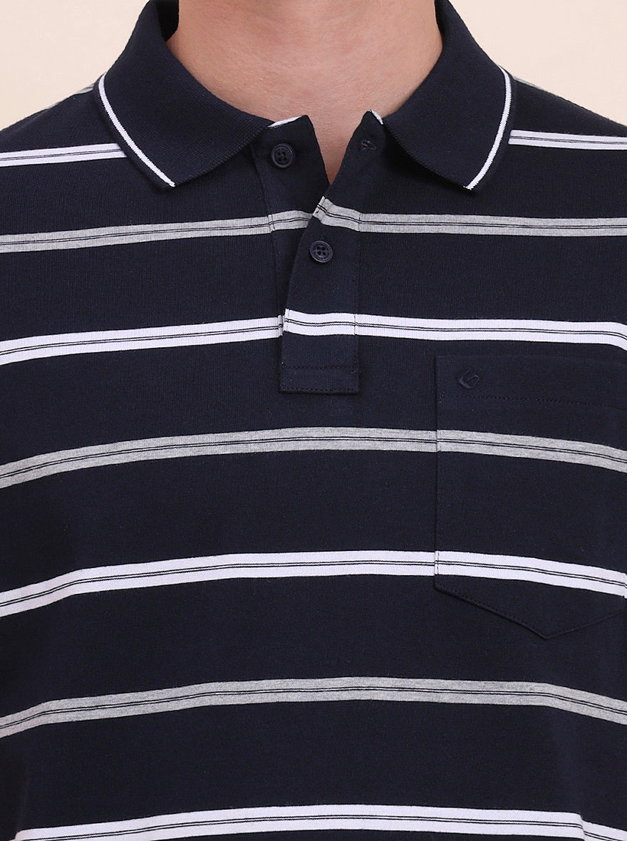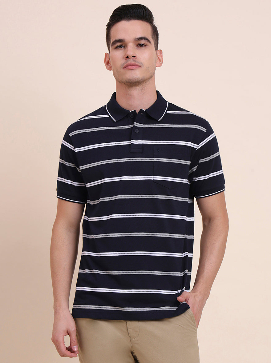 Navy Blue & White Striped Regular Fit Polo T-Shirt | Greenfibre
