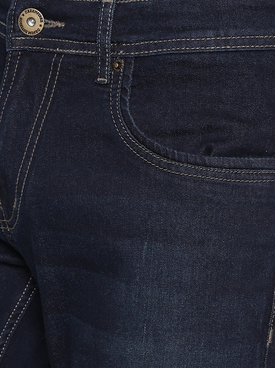 Details: Look comfortable and stylish when you wear this washed night blue jeans from Greenfibre. This pair of narrow fit jeans is made from skin-friendly cotton stretch fabric, which offers great fit, flexibility and wearing comfort to you. It features metal trims, belt loops, single button closure, zip fly fastening, 2 rear and 2 front functional pockets, logo embossed on the coin pocket. Wear it with a printed round neck T-shirt, shades and sneakers for a perfect casual look. Shop for this must-have jeans now!