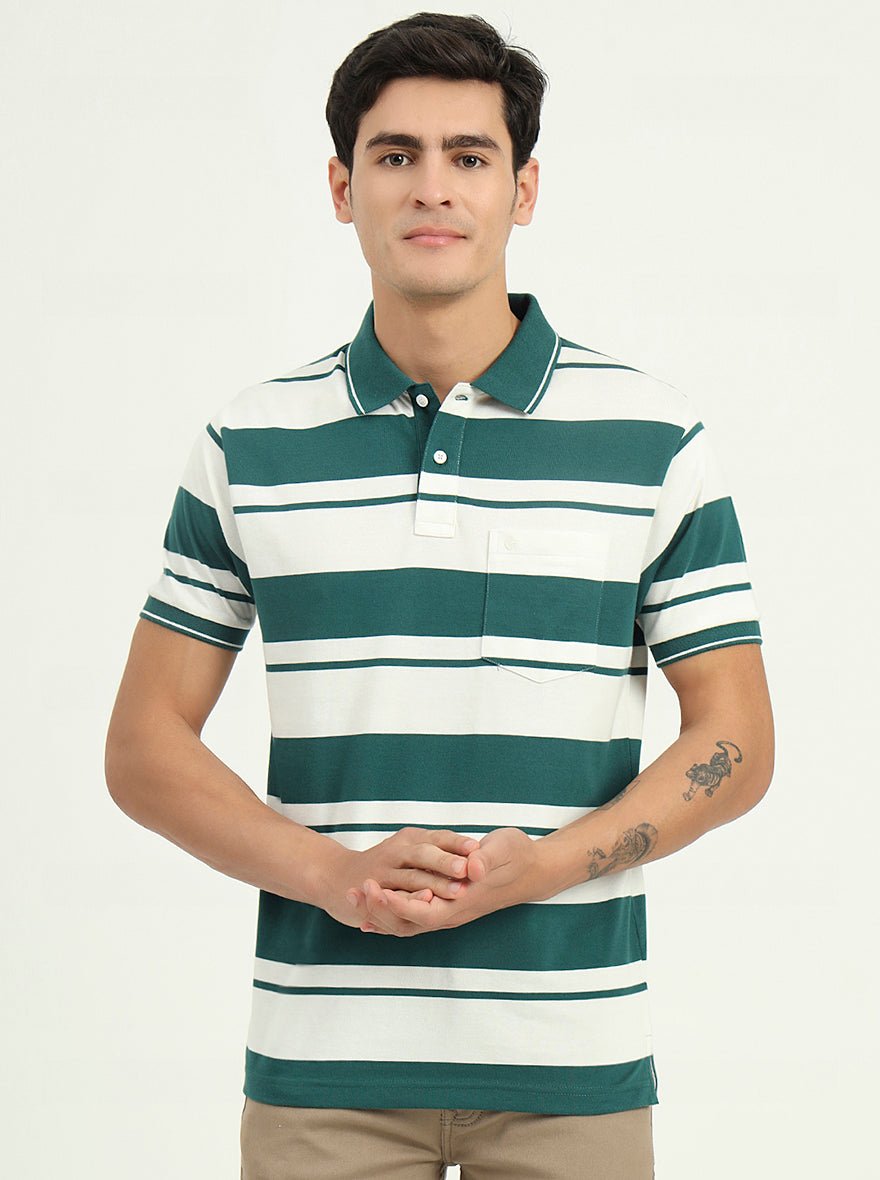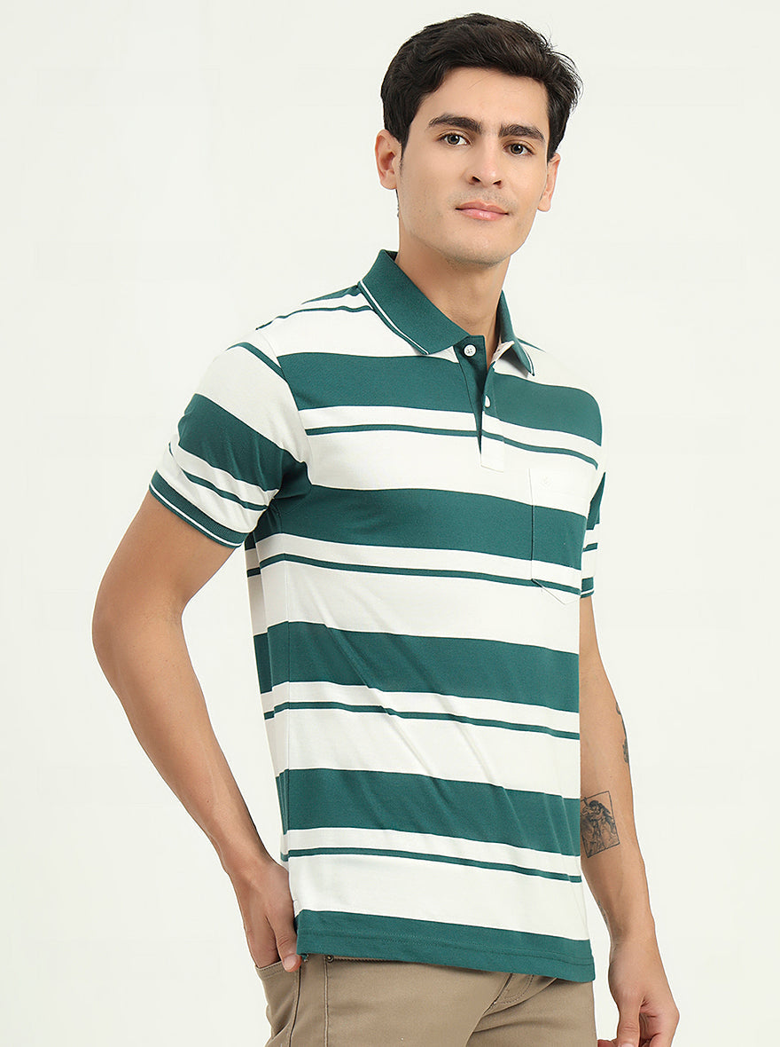White & Bottle Green Striped Slim Fit Polo T-Shirt | Greenfibre